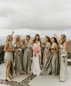 “At the moment in terms of colours sage and greens are definitely ‘in’ for bridesmaids, while brides are going back to the classics, with lots of satins, classic line and traditional silhouettes.”